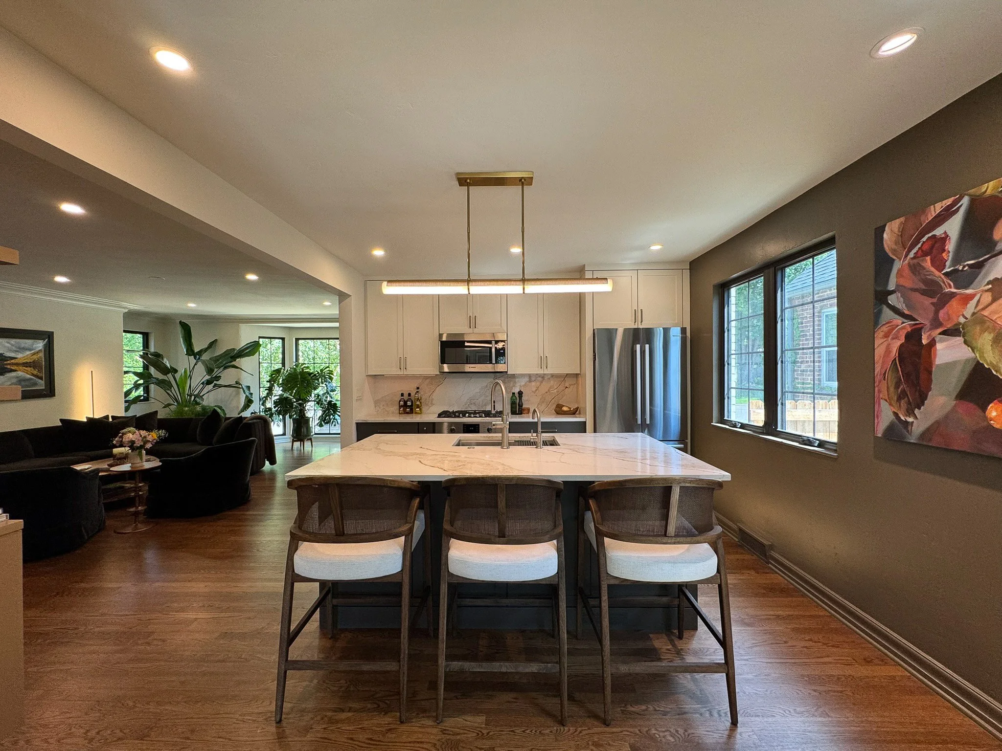 This thoughtfully executed interior renovation reimagines the main level of a classic Colonial home in Denver’s highly sought-after Hale neighborhood. Formerly a three-bedroom, one-bath layout, the space has been transformed into a bright, open-concept floor plan designed for modern living.